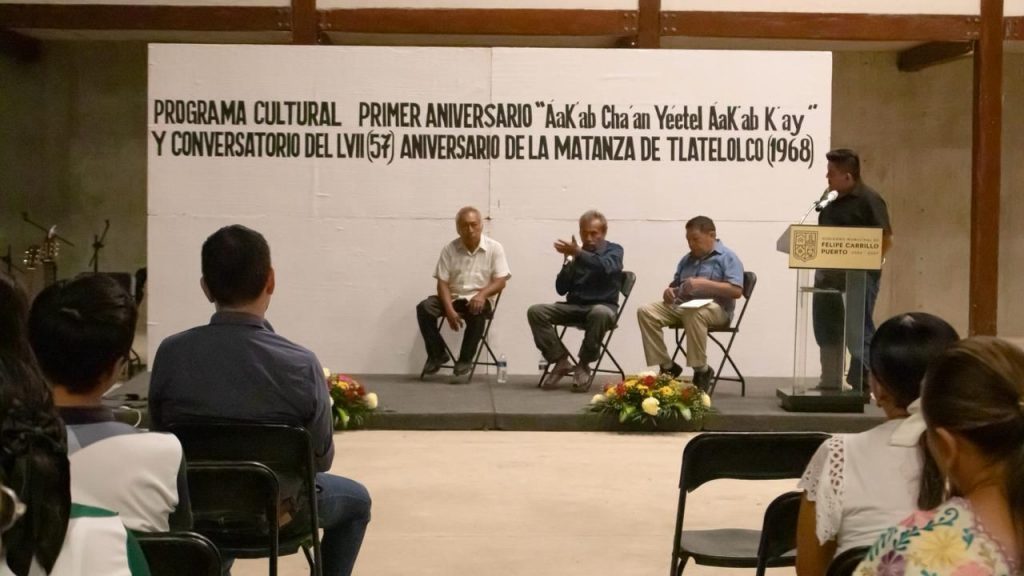Para conmemorar el 57 aniversario luctuoso del movimiento estudiantil de 1968 que derivó en la matanza de Tlatelolco en la plaza de las tres culturas, el Ayuntamiento de Felipe Carrillo Puerto a través de la dirección de educación municipal y la casa de la crónica, llevó a cabo un programa cultural y un conversatorio que tuvo como tema central el movimiento estudiantil.