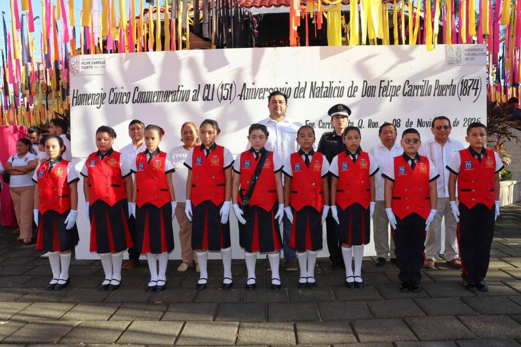 El Gobierno Municipal en coordinación con la escuela primaria Moisés Saénz y la Guardia Nacional, conmemoró con homenaje cívico el 151 aniversario del natalicio de Felipe Carrillo Puerto, acto cívico al pie del monumento del apóstol rojo de los mayas.