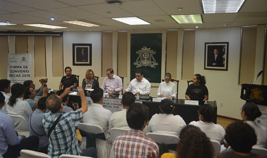 Junto con el Rector de la UQROO, Dr. Ángel Rivero Palomo y como testigos la Secretaria de Salud, Alejandra Aguirre Crespo y la diputada Sonia López Cardiel, se firmó el documento con el cual se destinarán becas para estudiantes con el fin de apoyar su alimentación, transporte, estudios de inglés, becas para estudiantes que son madres solteras, así como para estudiantes en extrema vulnerabilidad y becas para titulación.