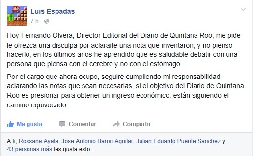 Ante eso, Luis Espadas fue claro con su respuesta que difundió en redes sociales: “Hoy Fernando Olvera, Director Editorial del Diario de Quintana Roo, me pide le ofrezca una disculpa por aclararle una nota que inventaron, y no pienso hacerlo; en los últimos años he aprendido que es saludable debatir con una persona que piensa con el cerebro y no con el estómago”.