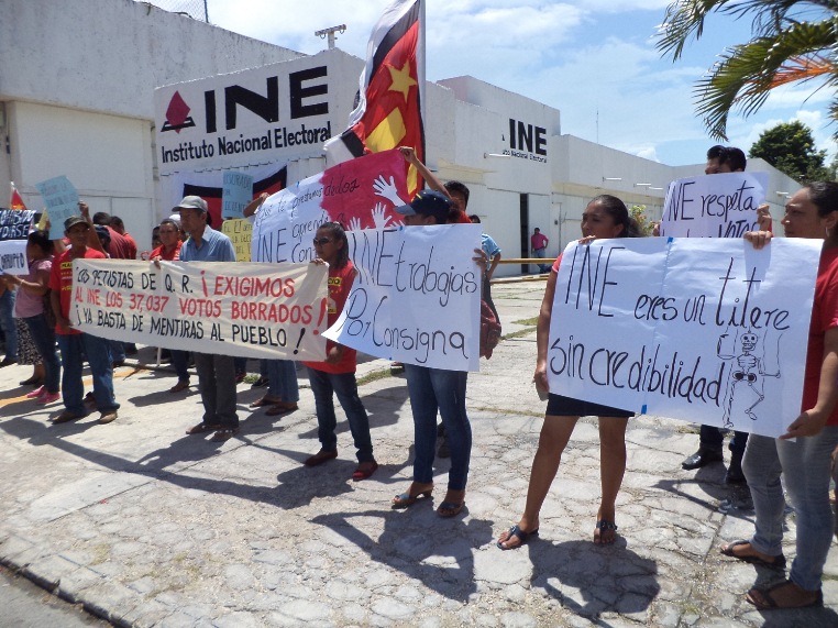Unos 80 militantes y simpatizantes del Partido del Trabajo (PT) en Quintana Roo se manifestaron este martes en la entrada de las oficinas de la Junta Local del Instituto Nacional Electoral (INE) en protesta por “congelar” sus cuentas a nivel estatal, ya que los 380 mil pesos mensuales que recibían como prerrogativas los administrará ahora un interventor nombrado por el organismo electoral nacional.
