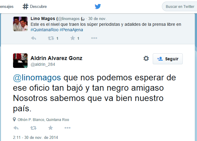“Este es el nivel que traen los súper periodistas y adalides de la prensa libre en #QuintanaRoo #PenaAjena”, escribió el funcionario, recibiendo como respuesta del jovenzuelo de 26 años su aguda “crítica” a este “tan bajo y tan negro” oficio. (Enlace: https://twitter.com/linomagos/status/538948405083791361)