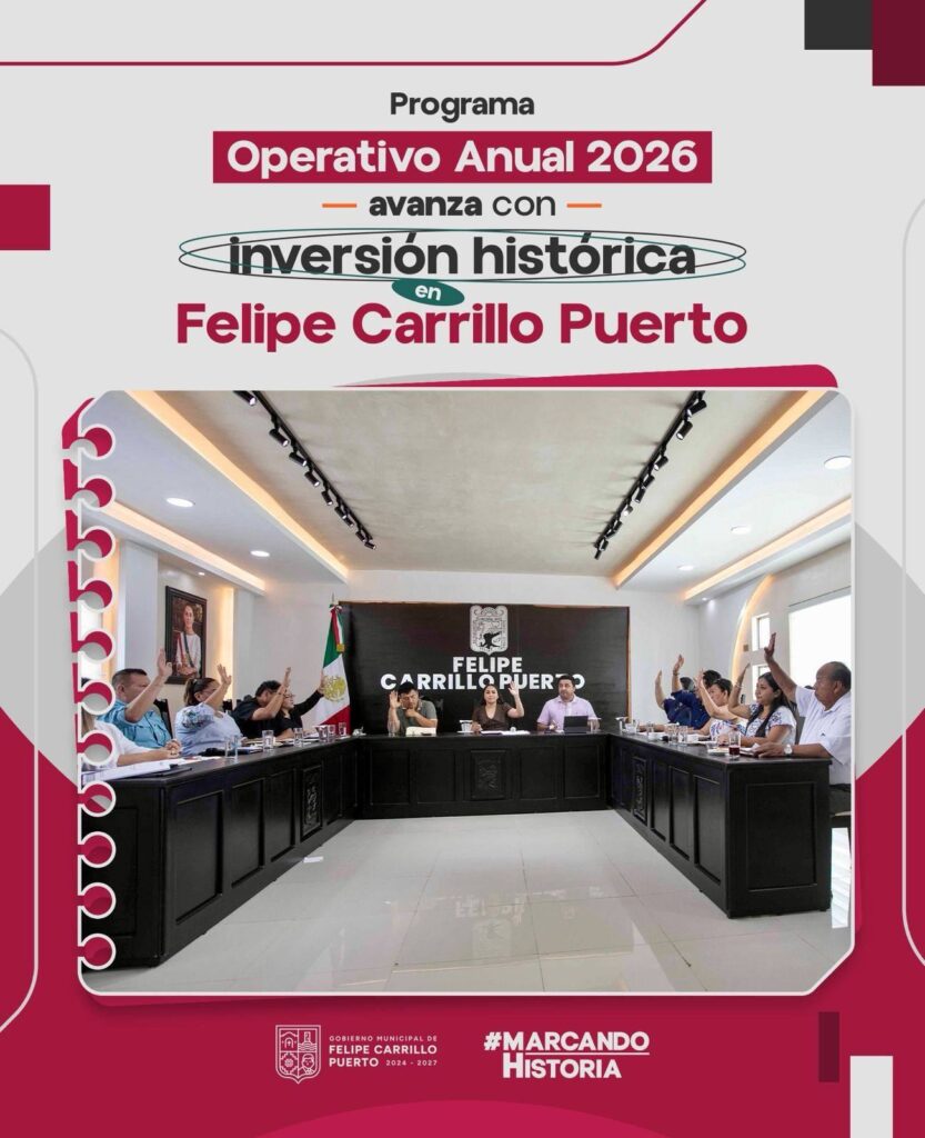 El Ayuntamiento de Felipe Carrillo Puerto, aprobó el primer bloque del Programa Operativo Anual 2026, con el que se proyecta la inversión histórica para el mejoramiento de alumbrado público, la construcción de cuartos dormitorios, nuevos parques públicos, techos y mejora vial mediante el programa de bacheo, lo anterior con recursos del Fondo de Aportaciones para la Infraestructura Social Municipal y de las Demarcaciones Territoriales del Distrito Federal (FAISMUN).