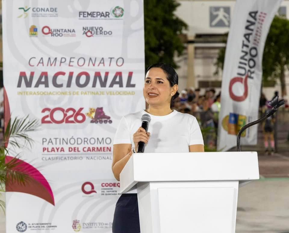 La presidenta municipal Estefanía Mercado inauguró el Campeonato Nacional Interasociaciones de Patinaje de Velocidad 2026, en el Poliforum Playa del Carmen, donde destacó el impulso de su gobierno al deporte como motor de desarrollo, bienestar y construcción de comunidad.