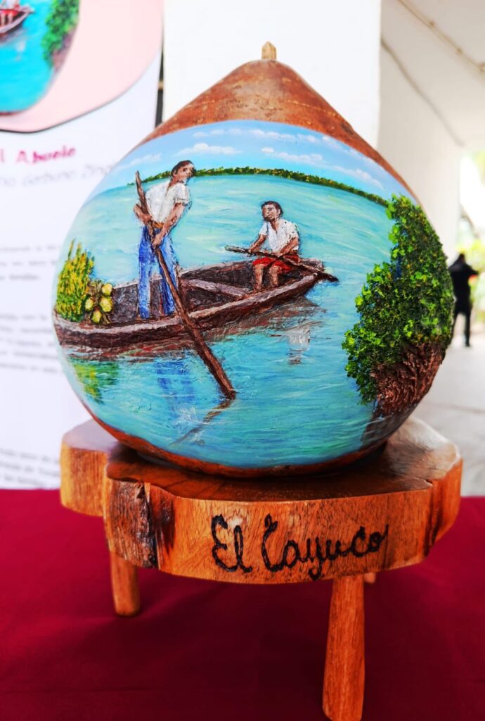 Se trata de un lek —calabazo tradicional utilizado por comunidades mayas— intervenido con pintura al óleo en técnica de relieve, que trasciende lo estético para convertirse en un relato vivo de la memoria colectiva. La pieza fue inspirada en la historia del señor Fidel García Chí, quien compartió recuerdos de su infancia navegando el Río Hondo entre Belice y Chetumal, evocando una época marcada por el intercambio cultural, el trabajo comunitario y las tradiciones que dieron origen a la identidad de la región.