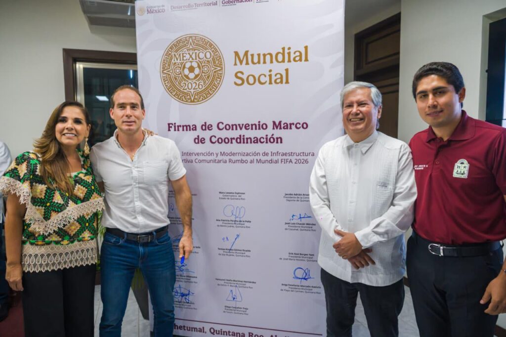 El presidente municipal, Diego Castañón Trejo, participó en la firma del Convenio Marco de Coordinación para la Intervención y Modernización de Infraestructura Deportiva Comunitaria rumbo al Mundial FIFA 2026, como parte del proyecto federal “Mundial Social”, acto encabezado por la gobernadora del estado, Mara Lezama, en el que se anunció la construcción de dos canchas deportivas para el municipio de Tulum.