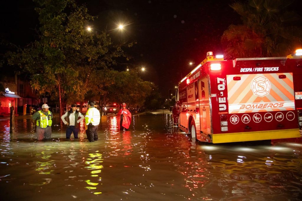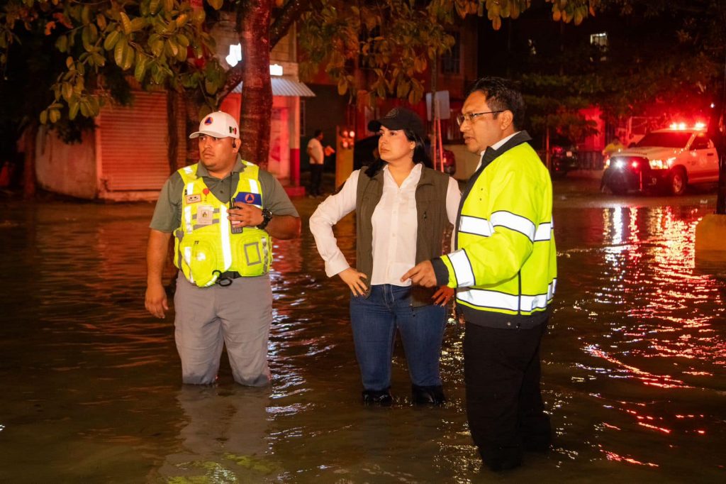 La presidenta municipal de Solidaridad, Estefanía Mercado, recorrió puntos críticos de la ciudad en los que se registraron encharcamientos severos a causa de la intensa lluvia que se registró la tarde noche de este jueves.