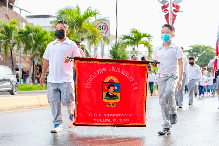 Posteriormente, los contingentes de las diferentes instituciones educativas se enfilaron para dar paso al tradicional desfile cívico-cultural que pese a las inclemencias del tiempo, no impidió el desarrollo del recorrido que finalizó sobre el palacio municipal donde se encontraban las autoridades encabezadas por el alcalde Dzul Caamal y las reinas de las fiestas patrias en Tulum, María José Ordaz del Toro, Cinthia Gloria Ordaz del Toro y Silvia Naomi Lizárraga Robles.