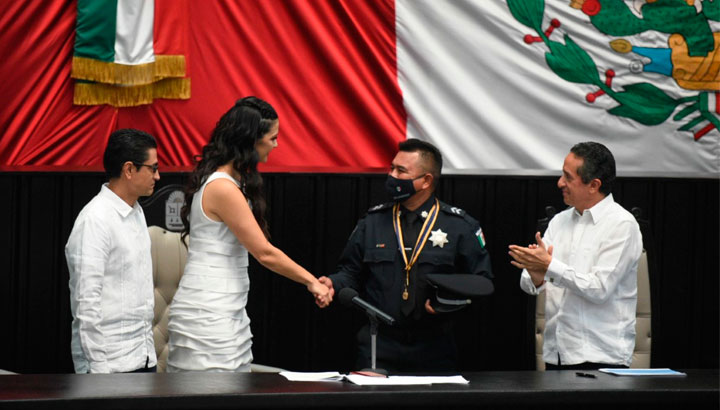 En sesión solemne de la XVI Legislatura del Estado, los elementos policiales Bianca Fabiola Pech Dzib y Jesús Gabriel Dzul Piña fueron galardonados con la Medalla al “Mérito Policial de Quintana Roo”, como reconocimiento a su labor, así como por haber destacado por sus acciones, disciplina, labores institucionales relativas al desempeño de su cargo, funciones y su servicio a la sociedad.