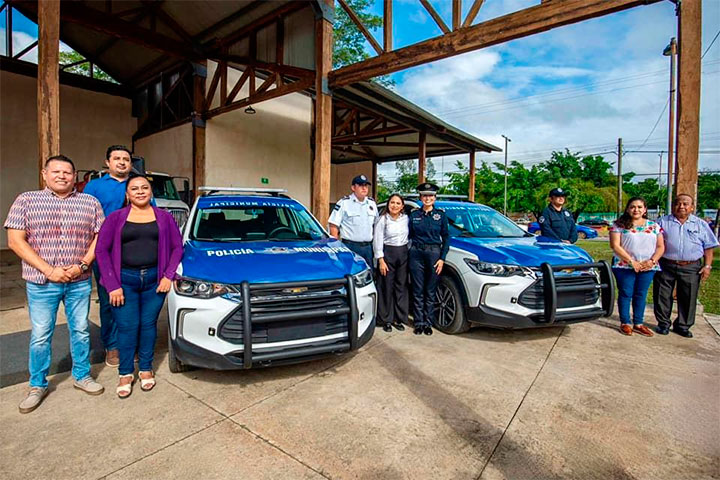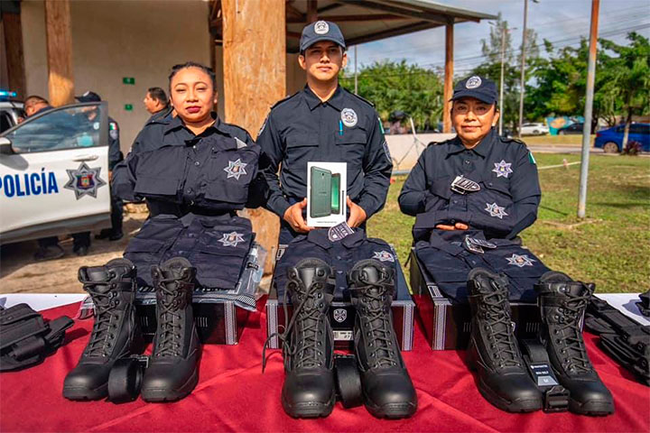 La presidenta municipal de Felipe Carrillo Puerto, Mary Hernández, entregó equipamiento nuevo a la Dirección General de Seguridad Pública, Tránsito y Bomberos, entre lo que destacan dos patrullas Chevrolet Tracker, además de uniformes completos, botas, cinturones tácticos, fornituras y ocho tabletas electrónicas que mejorarán la operatividad de los elementos de seguridad.