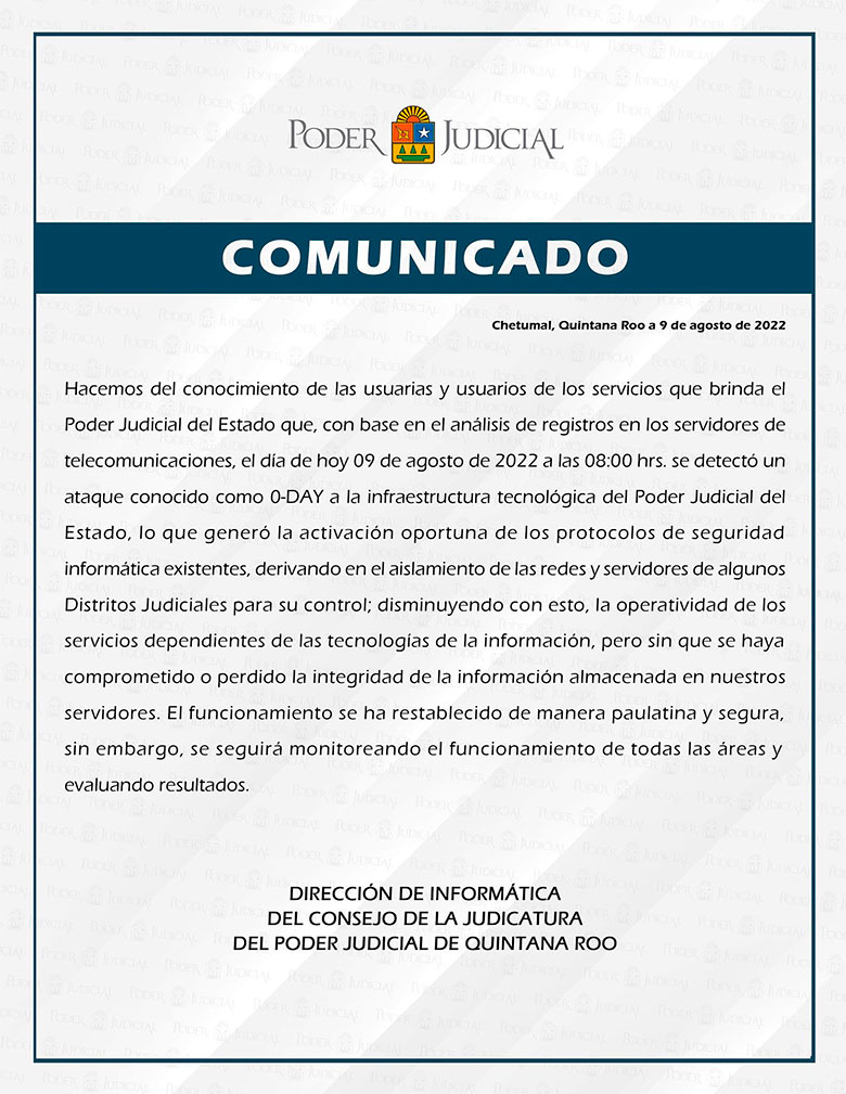 A través de un mensaje, el Poder Judicial de Quintana Roo confirmó el ataque de ransomware por lo que exhortó a sus empleados a no abrir ningún correo enviado desde el dominio tsj.qroo ni cualquier otro correo con archivos adjuntos no solicitados, incluyendo archivos comprimidos, PDF, Docs, excel, ligas a sitios externos que no conozcan.