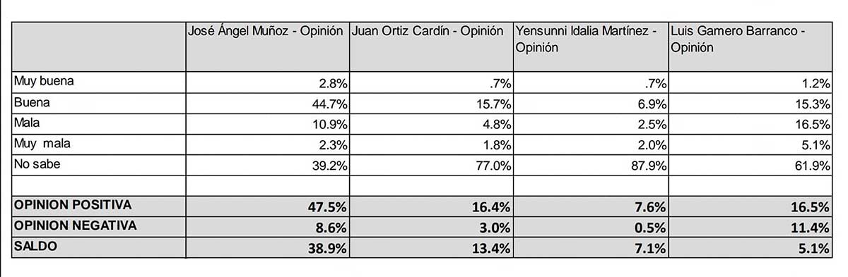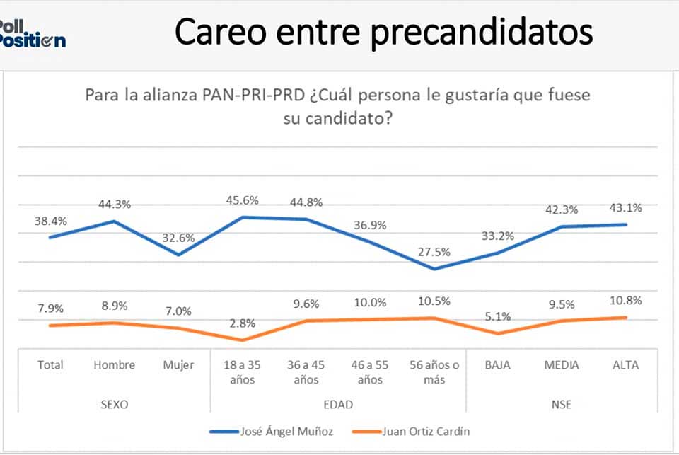 Sin embargo, al ponerle nombre a los candidatos y enfrentarlos en careos, José Ángel Muñoz resultó triunfador en todos los escenarios planteados en el ejercicio, superando por más de 30 puntos porcentuales a Juan Ortiz Cardín en el careo interno, y por casi 30 puntos a Yensunni Martínez en un eventual enfrentamiento.