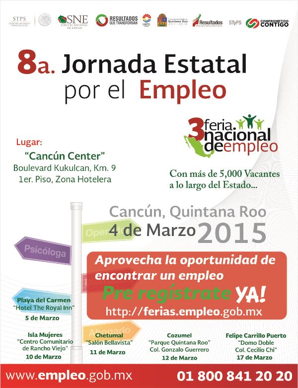 La Secretaría del Trabajo y Previsión Social del Estado, a través del Servicio Estatal de Empleo y Capacitación para el Trabajo, previo al inicio de la temporada más alta del sector turístico, realizará la ya tradicional Jornada Estatal por el Empleo en su octava edición. Éste es un proceso de reclutamiento masivo, ante el periodo de alta contratación que se avecina, específicamente en las ciudades de Cancún, Playa del Carmen y en general la Riviera Maya, inclusive contratando gente de comunidades como Felipe Carrillo Puerto.
