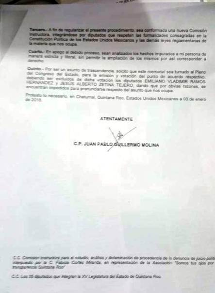 Al respecto, el legislador dijo que se cotejara la firma que lleva el escrito entregado el pasado viernes 5 de enero a las 12:53 horas, dirigido a la Comisión Instructora de la XV Legislatura, para verificar si corresponde a la de Guillermo Molina.