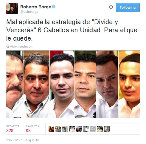 El alcalde capitalino Eduardo Espinosa Abuxapqui, quien fue el primero en destapar sus intenciones para contender por la gubernatura, agradeció al gobernador Roberto Borge Angulo su inclusión en una fotografía que circuló el mandatario en su cuenta de Twitter, donde presumió la unidad de los seis “caballos” del PRI en la carrera sucesoria.