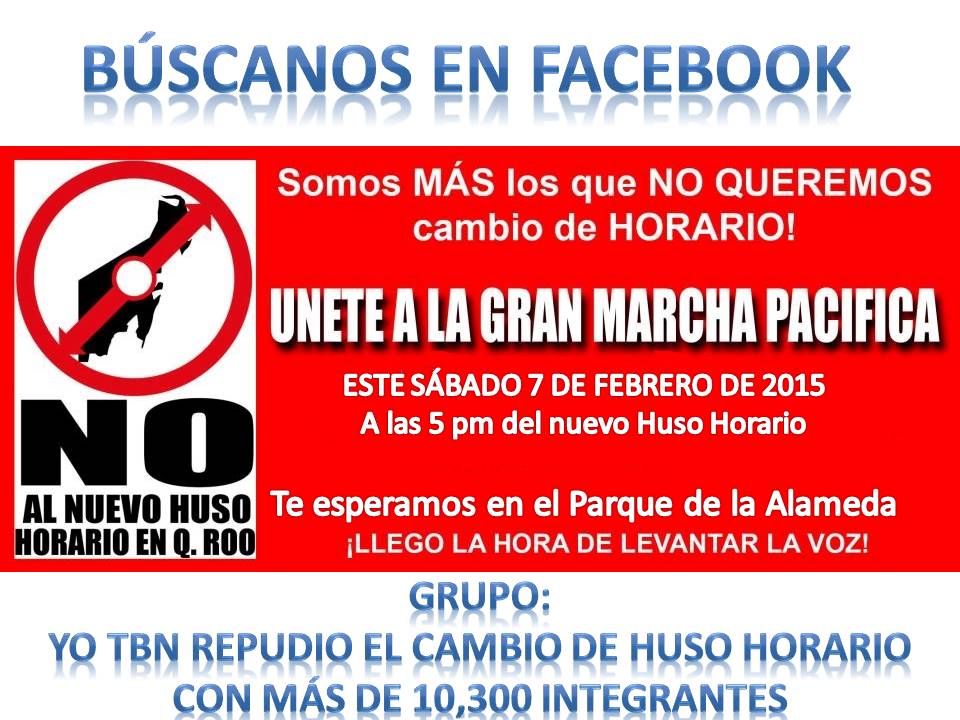 La invitación para la marcha en contra del nuevo horario se está realizando fuertemente en las redes sociales, a través del grupo de Facebook “YO TBN REPUDIO EL CAMBIO DE HUSO HORARIO EN QUINTANA ROO”, el cual cuenta con 10 mil 390 miembros.