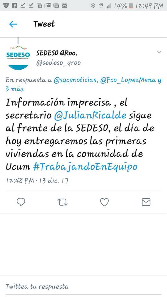 Tras declarar en una entrevista que los titulares de las Secretarías de Finanzas y Planeación y Desarrollo Social, Juan Vergara Fernández y Julián Ricalde Magaña, habían presentado sus renuncias para ir en busca de cargos de elección popular en el proceso de 2018, el Secretario de Gobierno, Francisco López Mena, negó su afirmación y dijo que nunca habló de renuncia alguna, sino de que “hay aspiraciones legítimas de estos dos funcionarios del gabinete que buscarían un cargo de elección”.