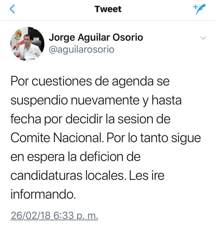 Vía Twitter, el dirigente estatal del PRD, Jorge Aguilar Osorio, informó que la sesión del Comité Nacional del Sol Azteca en la que se definirían los candidatos a las alcaldías de Quintana Roo nuevamente se pospuso por cuestiones de “agenda”.