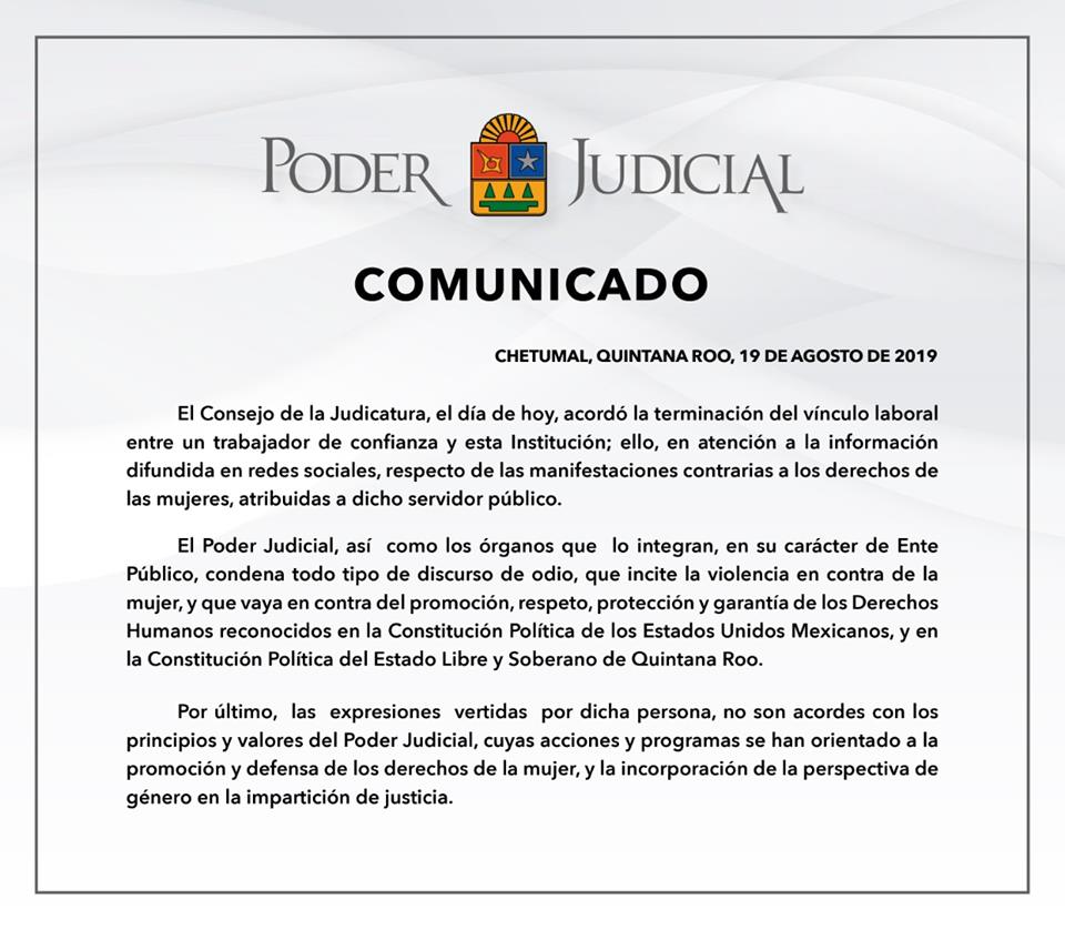 El pleno del Consejo de la Judicatura del Poder Judicial de Quintana Roo, notificó que tras una reunión extraordinaria efectuada este lunes se decretó el cese de funciones y terminación laboral del C. Ernesto Mahammar Reyes Lara, quien fungía como actuario en Chetumal después de ser señalado en redes sociales por incitación a la violencia y comentarios misóginos sobre las manifestaciones de colectivos feministas #NoMeCuidanMeViolan y #ExigirJusticiaNoEsProvocación el pasado fin de semana.