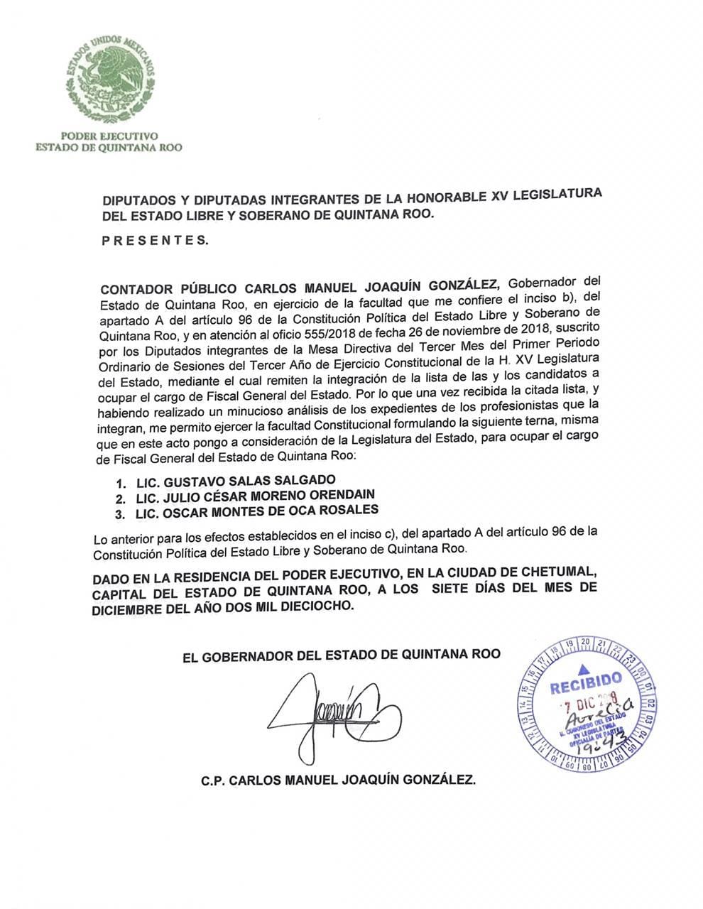 Tras enviar al Congreso del Estado la terna definitiva de la cual los diputados seleccionarán al nuevo Fiscal General, el gobernador Carlos Joaquín González indicó que los finalistas fueron elegidos por “su experiencia, conocimiento, currículum y buena imagen”, con lo cual se busca que se elija a la persona más idónea para ocupar ese importante cargo.