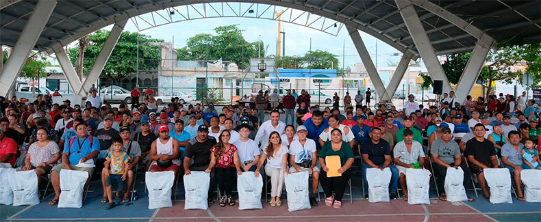 Trabajadores del sector pesquero independiente de Benito Juárez que se vieron afectados por las lluvias torrenciales, recibieron de la gobernadora Mara Lezama Espinosa apoyos alimentarios durante un evento realizado en el parque urbano de Puerto Juárez en Cancún.