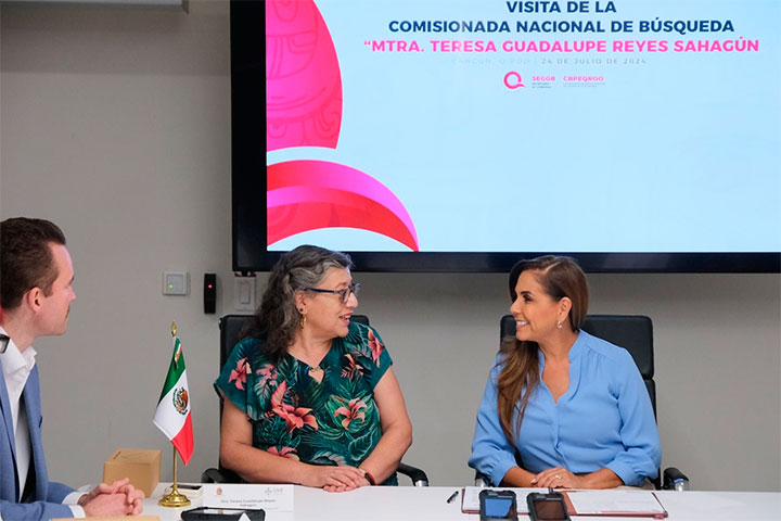 La gobernadora Mara Lezama Espinosa sostuvo una reunión de trabajo con la Comisionada Nacional de Búsqueda, Teresa Guadalupe Reyes Sahagún, y la presencia del Coordinador del Programa de Identificación Humana del Fondo de Población de Naciones Unidas, Maximilian Muck.