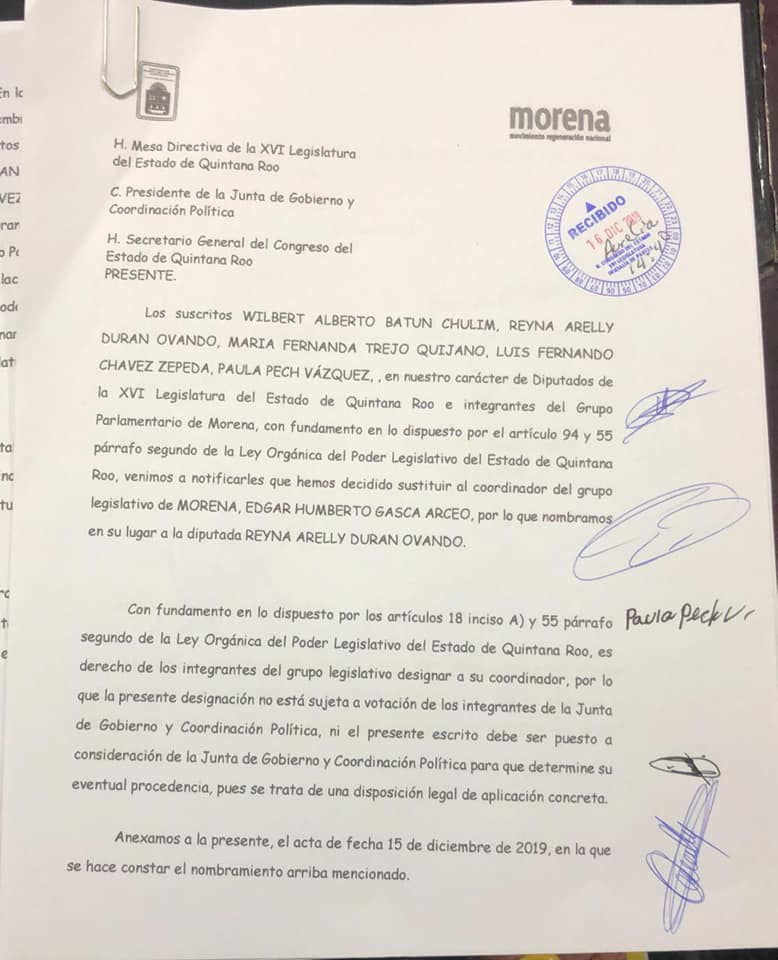 El acuerdo fue ratificado por los diputados Alberto Batún, Luis Fernando Chávez, María Fernanda Trejo, Paula Pech y la propia Reyna Durán, a fin de darle rumbo a las acciones del órgano legislativo estatal. Reyna Durán es militante fundadora de morena, que además ganó por mayoría relativa en el distrito V y es activa impulsora de la 4T en Quintana Roo.