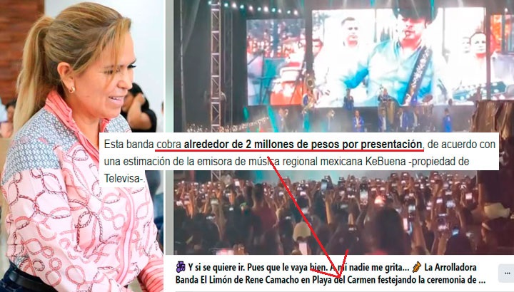 Se indagó con una empresa promotora de espectáculos musicales que, en el caso particular de la banda “La Arrolladora”, los costos de presentación van de los 900 mil hasta los dos millones de pesos, dependiendo de lo solicitado, y nos aseguraron que no realizan presentación alguna sin recibir al menos el 70 por ciento de anticipo.