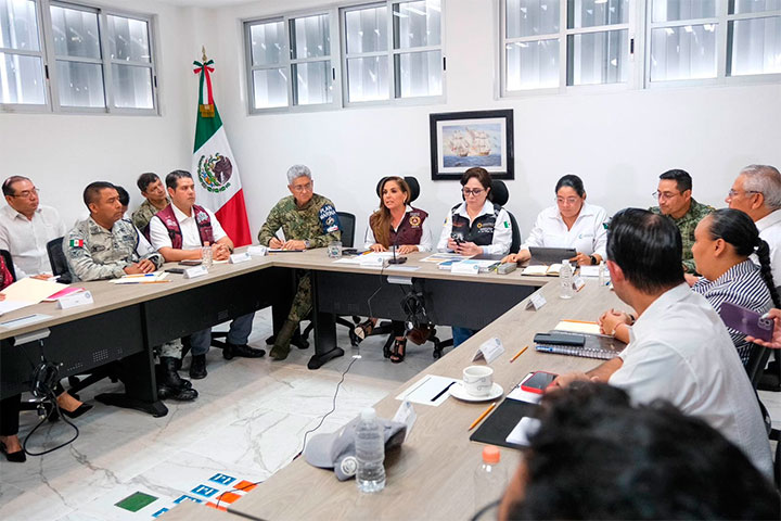Encabezado por la gobernadora Mara Lezama Espinosa y la coordinadora nacional de Protección Civil Laura Velázquez Alzúa, acompañados por los altos mandos del Ejército, Marina, Guardia Nacional, así como el Sistema DIF, y miembros del gabinete, en esta reunión de trabajo se tuvo, de nueva cuenta, enlace con cada uno de las y los presidentes municipales para continuar con las acciones preventivas.