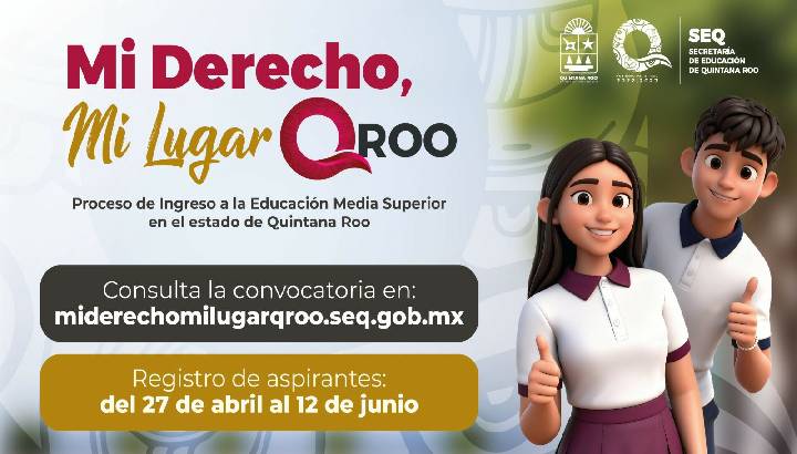La Secretaría de Educación de Quintana Roo (SEQ), que encabeza su titular, Elda Xix Euán, invita a las y los jóvenes a participar en el nuevo proceso de asignación de espacios en el nivel medio superior “Mi derecho, mi lugar Quintana Roo”, cuya convocatoria está disponible a partir de este martes 14 de abril.