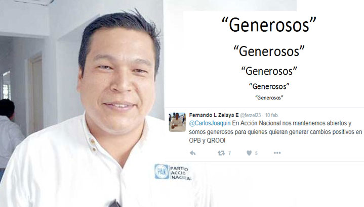 Poco después de anunciar que se separaría de su cargo de regidor para buscar la candidatura a la diputación local, Fernando Zelaya escribió el siguiente tuit: “@CarlosJoaquin En Acción Nacional nos mantenemos abiertos y somos generosos para quienes quieran generar cambios positivos en OPB y QROO!”.